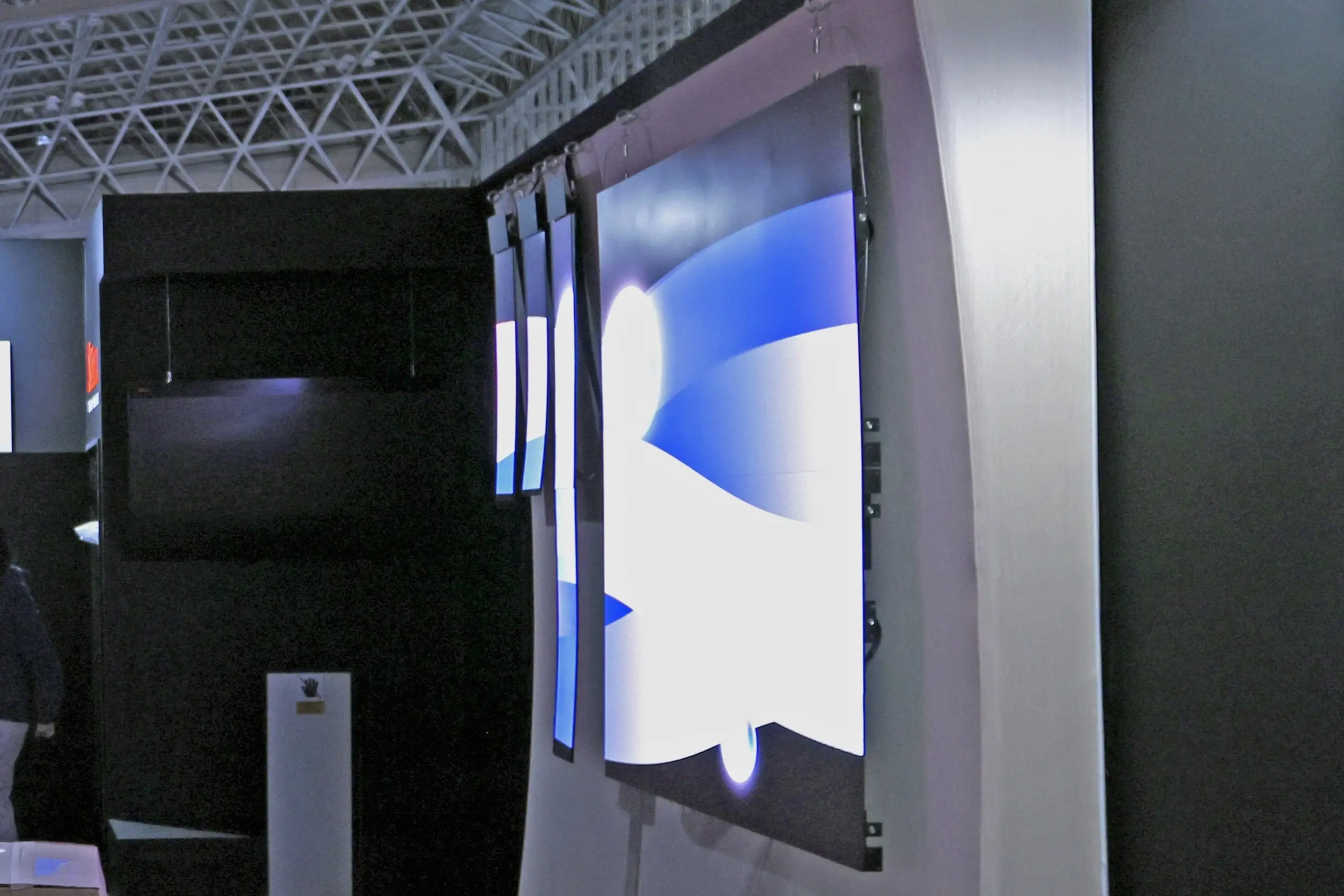 采用两款悬挂式展示:单片长条型与两片拼接的细长显示屏。通过多屏拼接可实现尺寸自由调整的特性,使观众能直观理解LED显示屏的扩展能力。悬挂式设计更突显其轻薄特性,侧面观展的观众纷纷对其轻盈质感赞叹不已。